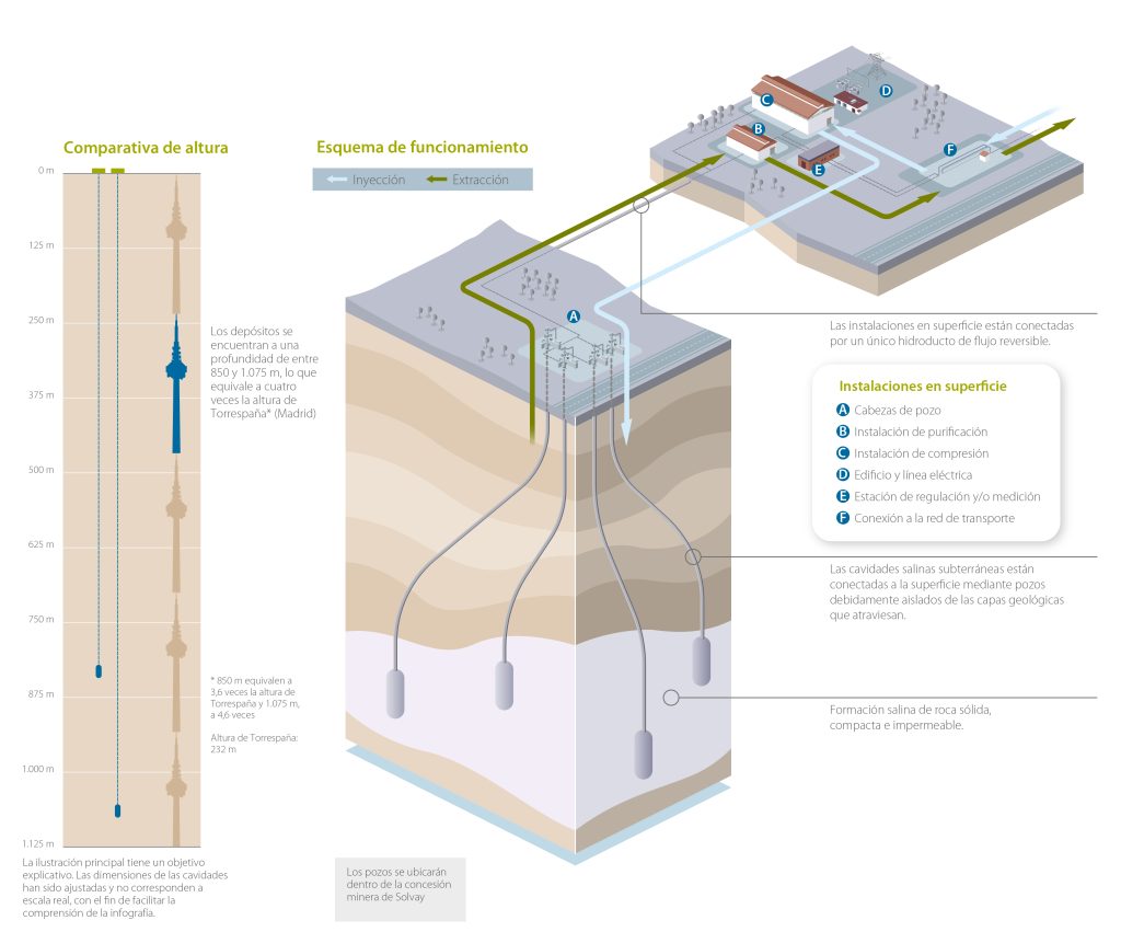 El hidrógeno procedente de la red se inyectará en las cavidades salinas en los momentos de mayor generación renovable y será extraído en los momentos en que la demanda de hidrógeno sea superior a la generación.