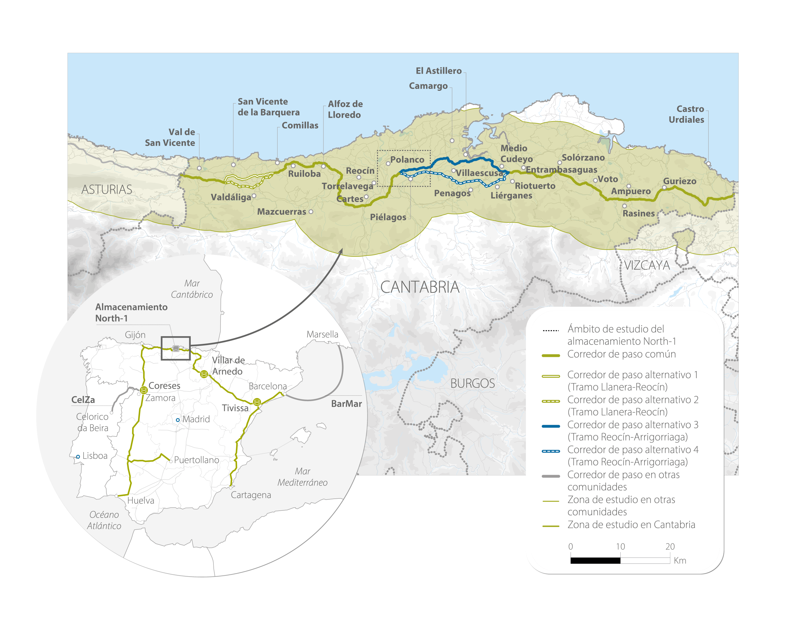 Enagás Infraestructuras de Hidrógeno, siguiendo el mandato del Ministerio para la Transición Ecológica y el Reto Demográfico de julio de 2024, ha iniciado el desarrollo del Proyecto PCI 9.24.1. “Hydrogen Storage North-1”, ubicado en Cantabria, cuyo objetivo es desarrollar un almacenamiento subterráneo de hidrógeno que aporte flexibilidad a la Red Troncal Española de Hidrógeno.