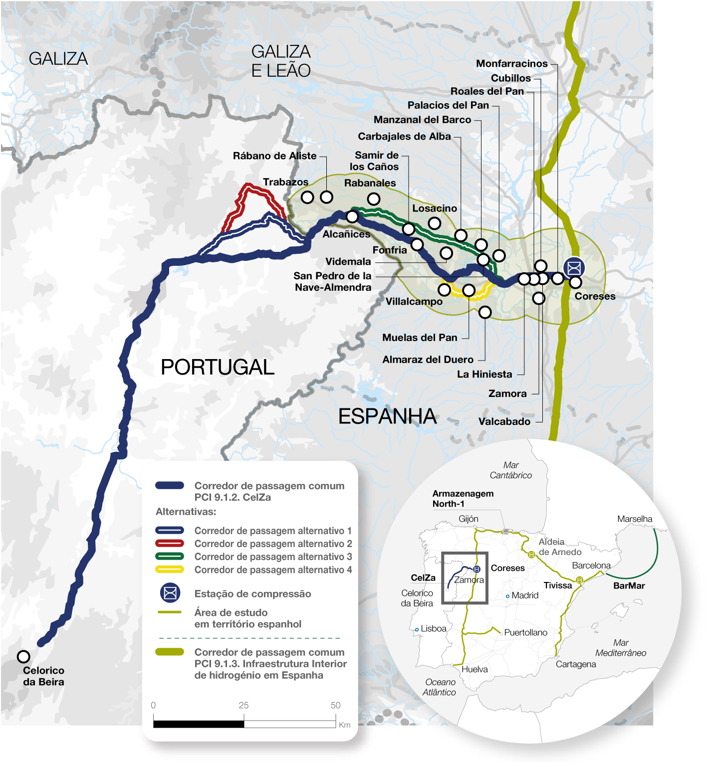 Além disso, o projeto CelZa inclui uma estação de compressão de 30 MW em Coreses (Zamora), que será o ponto de ligação entre as duas infraestruturas internas de cada país.